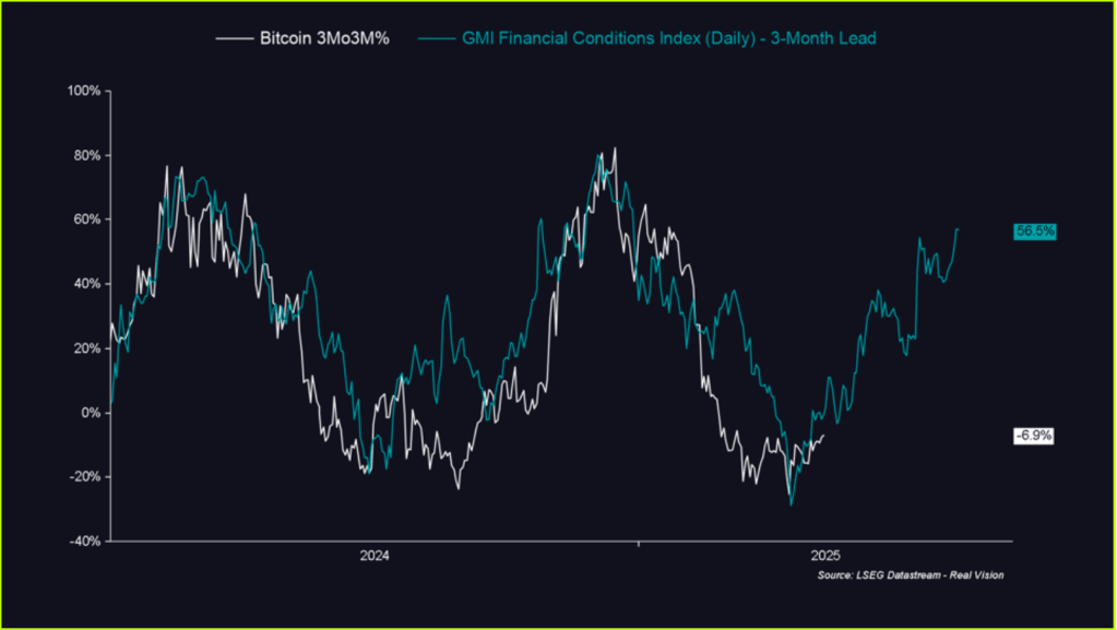 Historically, Bitcoin price action lags financial conditions by about three months. The GMI Financial Conditions Index bottomed in Q4 2024, and Bitcoin followed with a bottom in Q1 2025.