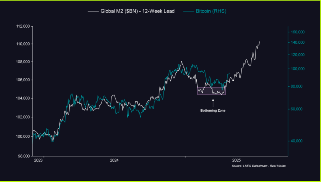 Another strong macro signal comes from the Global M2 money supply. Bitcoin typically lags changes in M2 by around 12 weeks. Global M2 bottomed in late Q4 2024 and began rising in January 2025, putting Bitcoin’s March rebound right on schedule.