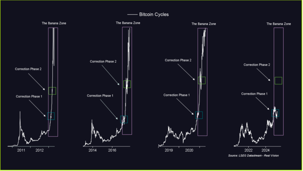 Finally, a look at the historical behavior of Bitcoin itself. According to RealVision, Bitcoin cycles go through identifiable phases—including what they call the “Banana Zone,” where price action turns parabolic.