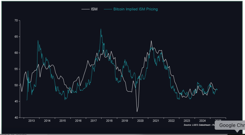 Until the ISM reaches 57, BTC is currently underpriced and below other cycle peaks.
