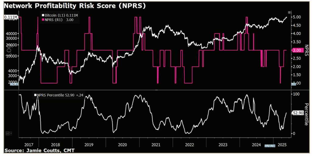 Gauges on-chain profit-taking behavior using MVRV, NUPL, and LTH-SOPR. High NPRS indicates widespread unrealised gains and potential for distribution; low NPRS suggests capitulation and buying opportunities.