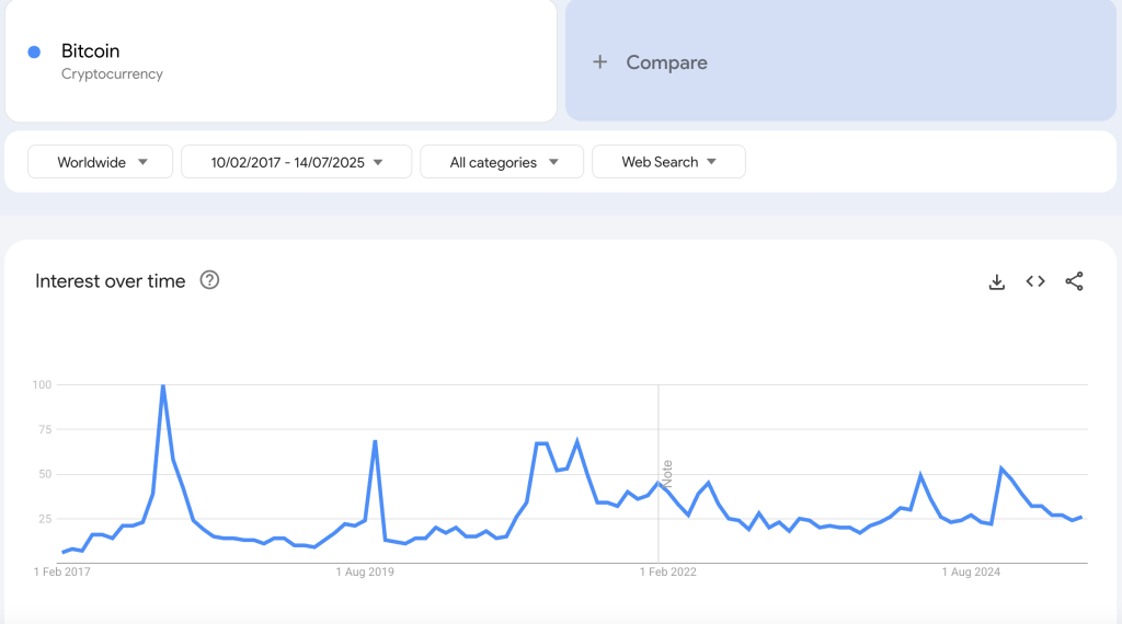 Google trends over a long term timeframe (since 2017) currently sits at 26 which is below the previous 2 peaks (100 in 2017 and 69 in 2021). Until this peaks above 60 over the long term range I believe there is still room to run.