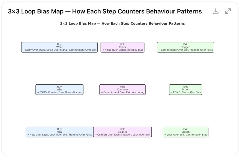 In my previous article, I outlined the psychological biases and behaviours that have repeatedly tripped me up as an investor. Understanding those biases was a big step, but knowing them wasn’t enough. I needed a simple framework I could actually use in real time……….before I buy, while I’m holding, and when I exit. That’s how the 3×3 Loop came about: three straightforward questions at each stage of an investment. It keeps me disciplined, limits emotional decision-making, and helps me avoid repeating the same costly mistakes.